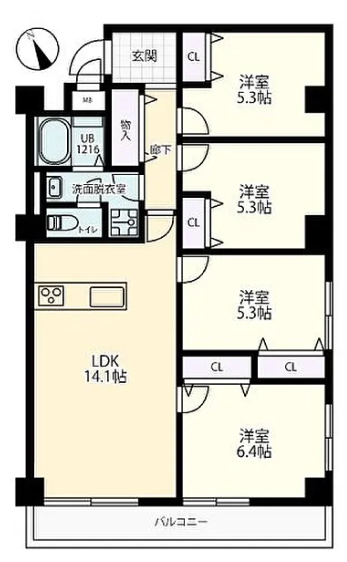 間取り | 4LDK(LDK約14.1帖 洋室約6.4帖 洋室約5.3帖X3) | ||