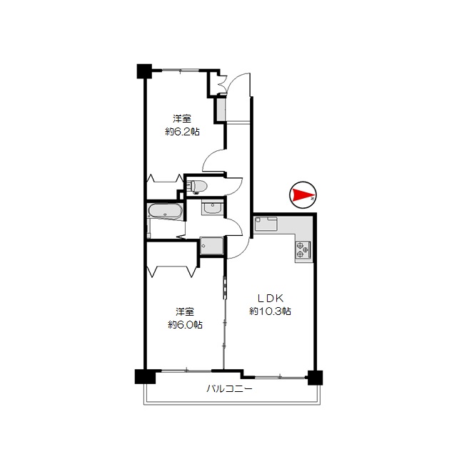 | 間取り | 2LDK(LDK約10.3帖 洋室約6.2帖 洋室約6.0帖) | ||