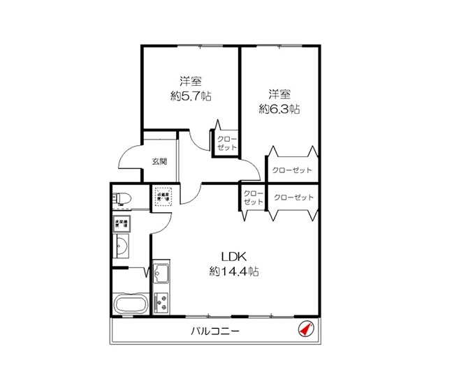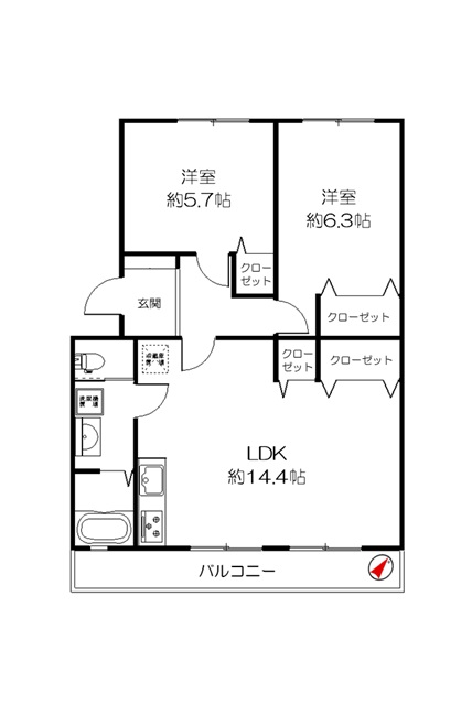 | 間取り | 2LDK(LDK約14.4帖 洋室約6.3帖 洋室約5.7帖) | ||