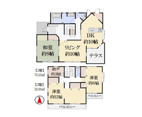 | 間取り | 3SLDK(リビング約10帖 ダイニングキッチン約10帖 洋室約12.0帖 和室約8.0帖 洋室約8.0帖 納戸約3.0帖) | ||